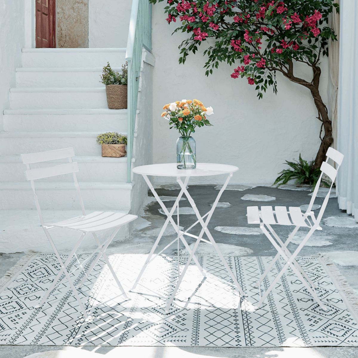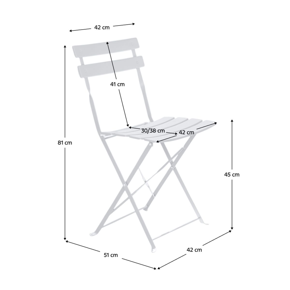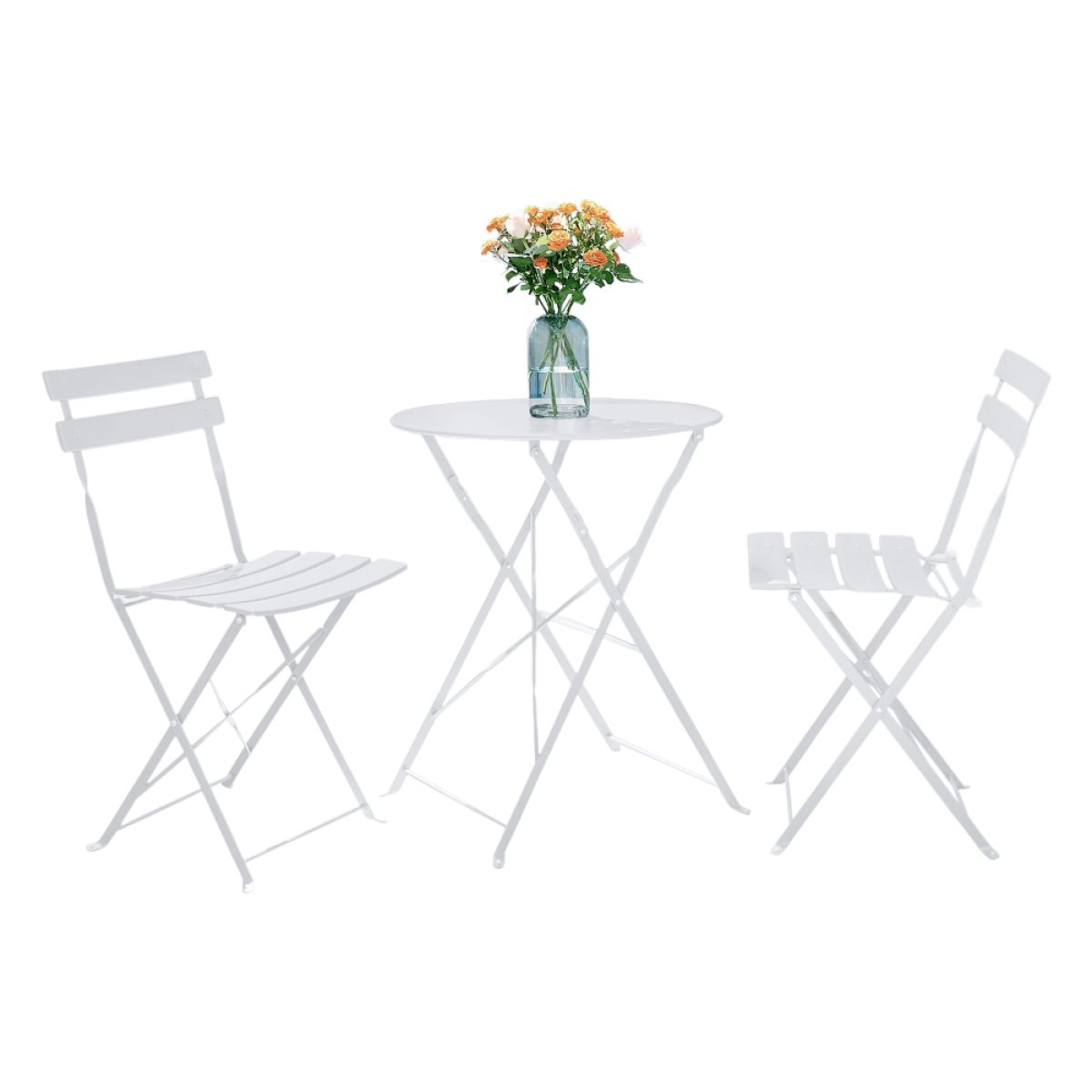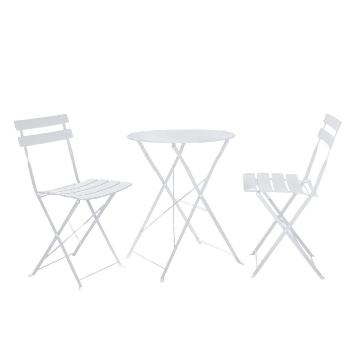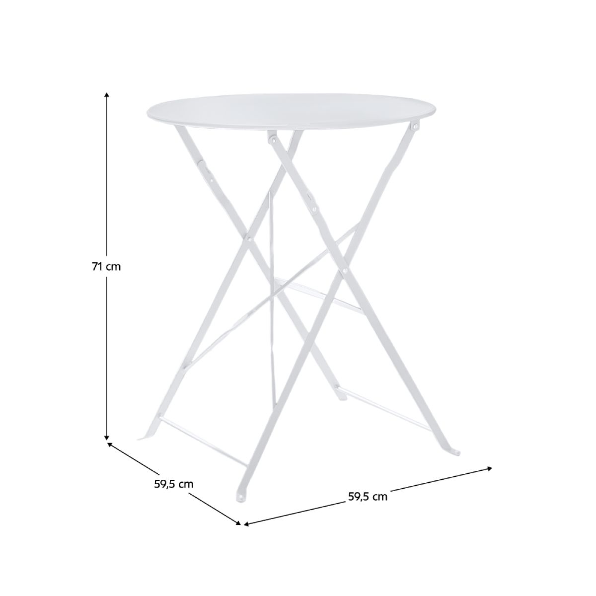 Material: oţel Culoare: albă Dimensiuni masă (LxAxÎ): 59,5x59,5x71 cm Dimensiuni scaun (LxAxÎ): 42x51x81 cm Înălţime scaun: 45 cm Adâncime scaun: 30/38 cm Lăţime scaun: 42 cm Înălţime spătar: 41 cm Lăţime spătar: 42 cm Capacitate de încărcare a mesei: 60 kg Capacitatea de încărcare a scaunului: 100 kg Set de 3 piese 1x masă 2x scaune Setul este pliabil Livrat asamblat