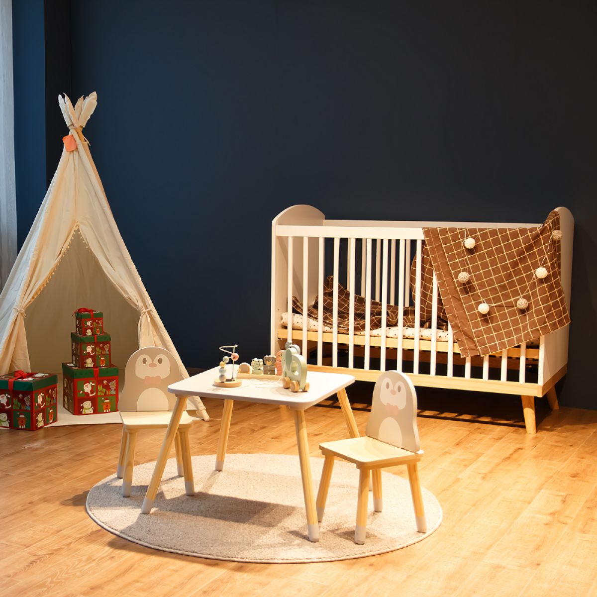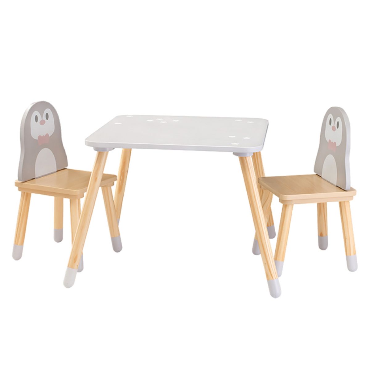 Material: MDF/lemn masiv de pin Culoare: alb/gri/motiv pentru copii pinguin Dimensiuni măsuţă (lxAxh): 50x50x42,5 cm Portanţă măsuţă: 50 kg Dimensiunile scaunului (lxAxh): 24x24x49,5 cm Portanţa a scaunului: 50 kg Înălţimea părţii de şezut: 20 cm Grosime material: 1,2-1,5 cm Set 1+2 1x masă 2x scaun Design magic Ideal pentru desen, joacă sau sărbători mici Potrivit pentru camera copiilor, grădiniţă şi zonă de joacă Dimensiune ideală pentru copii Margini rotunjite Utilizare în interior Curăţaţi cu o cârpă moale umedă şi apoi ştergeţi Să nu aşezaţi acest produs lângă o fereastră, astfel încât copilul să nu-l folosească ca treaptă şi să cadă Potrivit pentru copii cu vârsta cuprinsă între 3 şi 7 ani Îndeplineşte standardele de siguranţă EN 17191:2021 Livrat dezasamblat