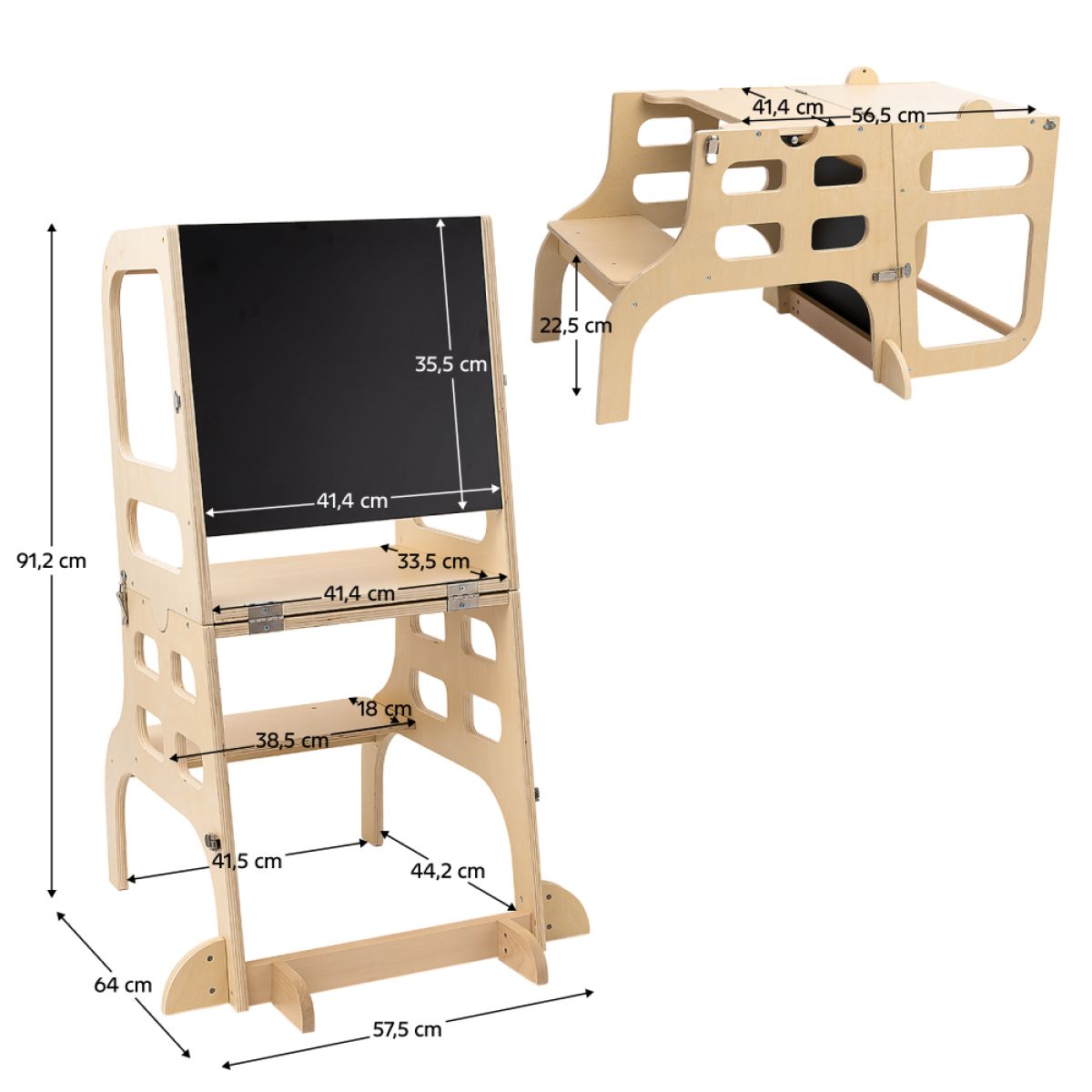 Material: lemn de pin Culoare: naturală Dimensiuni (lxAxh): 57,5x64x91,2 cm Portanţa: max. 50 kg Greutate: 6,20 cm Grosime material: 1,5 cm Montessori turn de învăţare 3în1 Turn de învăţare Măsuţă şi scaun Tablă de desen Uşor de manevrat Conduce copiii la independenţă şi învăţare Margini rotunjite Utilizare în interior Utilizaţi numai pe suprafeţe plane Curăţaţi cu o cârpă moale, umedă şi apoi ştergeţi Conceput pentru copiii cu vârsta peste un an care pot sta în picioare fără ajutor Îndeplineşte standardele de siguranţă EN 14988:2017 + A1:2020 Livrat dezasamblat