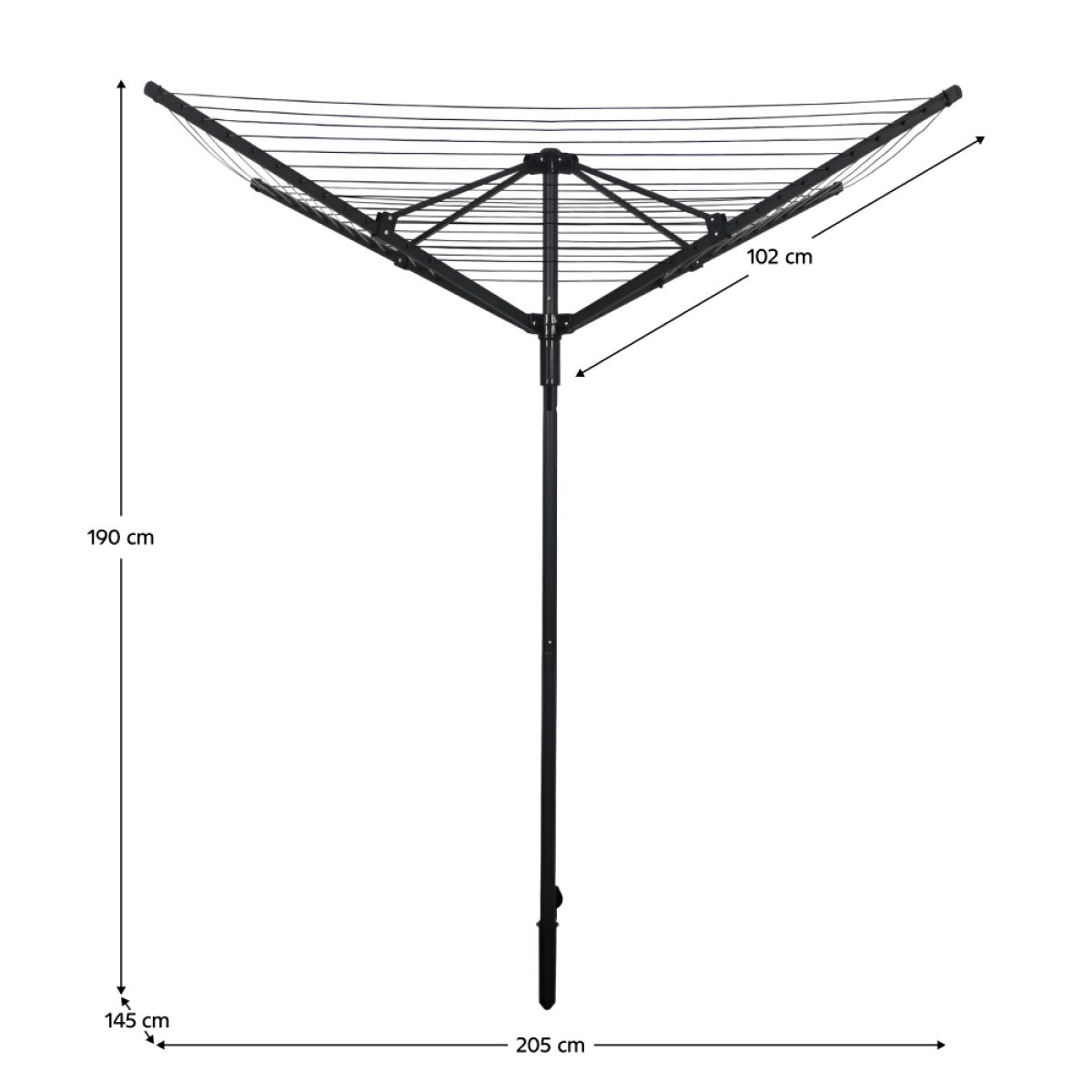 Material: fier Culoare: negru Dimensiunile uscătorului deschis (lxAxh): 205x145x190 cm Dimensiunile uscătorului închis (lxAxh): 12x12x117 cm Diametrul tijei de susţinere: 3,2 cm Portanţă: 25 kg Priză de împământare din plastic Rotativ 4 braţe Material de frânghie pentru uscare: PVC Lungimea firului pentru rufe: 45 m Utilizare în exterior Acoperire anticorozivă Rezistent la intemperii Vă recomandăm să protejaţi produsul de intemperii pentru a prelungi durata de viaţă a produsului