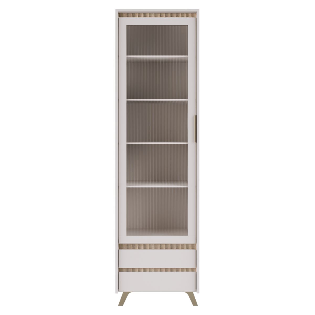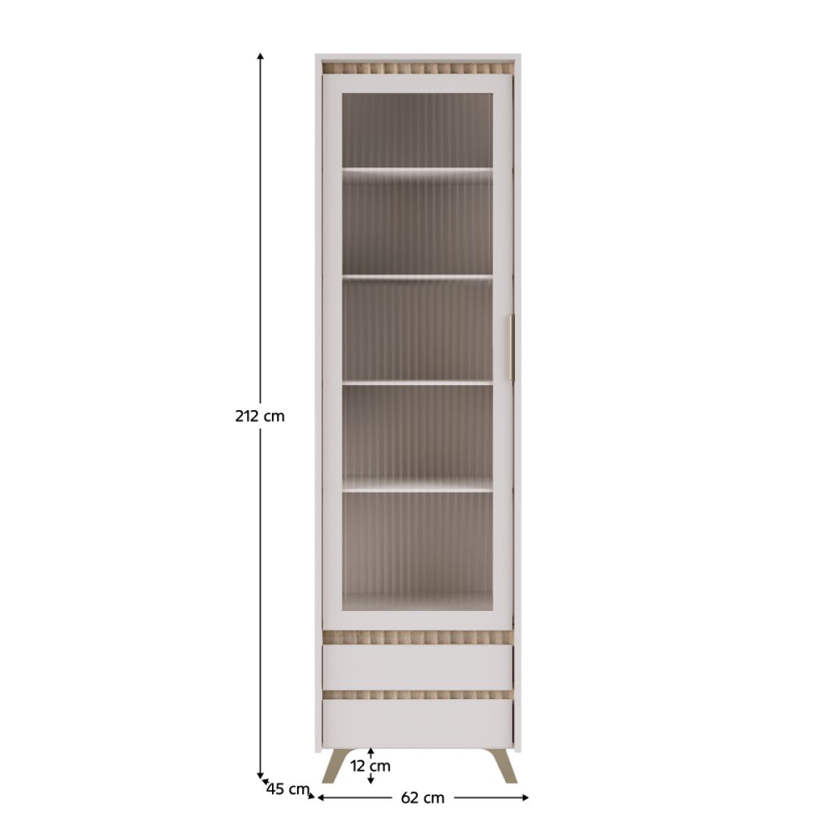 Material: DTD laminat/MDF înfoliat/folie PVC/sticlă Culoare: caşmir/stejar sonoma Dimensiuni (lxAxh): 62x45x212 cm Grosime material: 1,6-1,9 cm Cu o singură uşă Uşă cu sticlă Grosimea sticlei: 0,4 cm Sticlă lustruită Sticlă securizată Sticlă canelată Rafturi din sticlă transparentă Două sertare cu mâner Material mâner: metal Cu picioare Culoarea piciorului: naturală Înălţimea piciorului: 12 cm Rulmenţi cu bile extensibile complet Balamale Margine: hârtie impregnată cu polimeri termoreactivi/PVC Grosimea materialului ABS: 0,5 mm Grosime placă aglomerată partea din spate/fund sertar: 0,3 cm Culoare partea din spate/fund sertar: alb Frezare decorativă Design modern Livrat dezasamblat