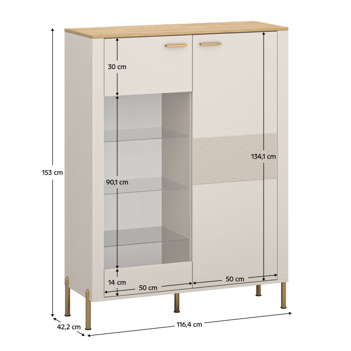 Material: DTD laminat/MDF înfoliat/PVC/sticlă Culoare: caşmir/stejar de piatră Dimensiuni (lxAxh): 116,4x42,2x153 cm Grosimea materialului: 1,6 cm Cu două uşi Dulap cu uşă Vitrat cu sticlă Cu poliţe Poliţe din sticlă Poliţe pline Portanţă poliţă: 3 kg Cu ??mâner Material mâner: metal Culoare mâner: auriu Pe picioare Material picior: metal Culoare picior: aurie Înălţime picior: 15 cm Uşi frezate decorativ Design modern Fără iluminare cu LED Opţiunea de a achiziţiona iluminare LED Vă recomandăm să ataşaţi mobilierul de perete Doar la comandă Livrat dezasamblat