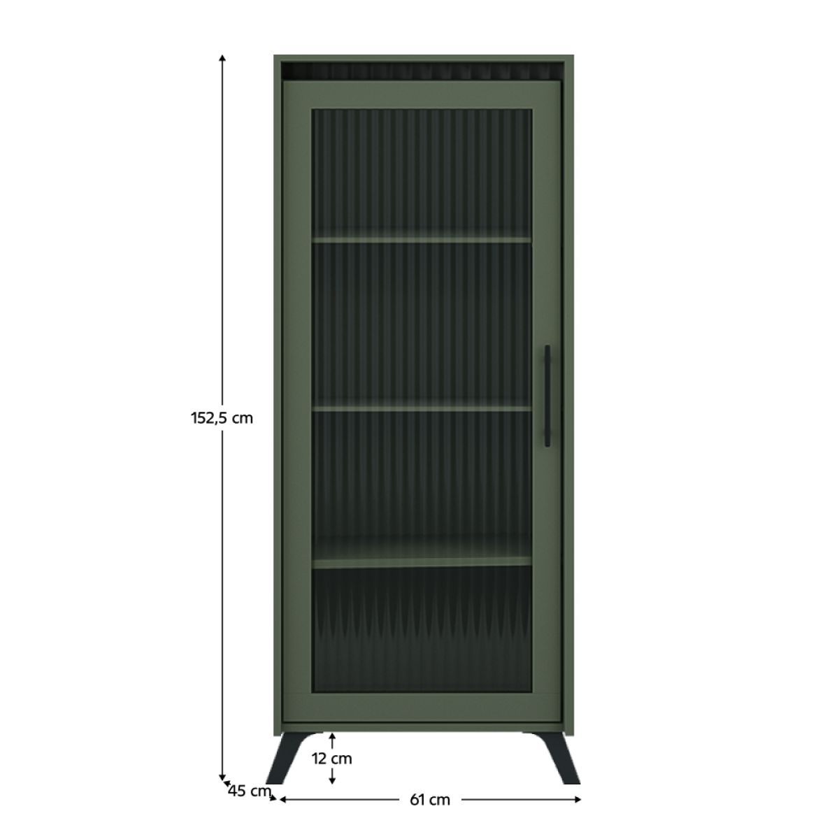 Material: DTD laminat /MDF înfoliat/folie PVC/sticlă Culoare: verde smoke/negru Dimensiuni (lxAxh): 61x45x152,5 cm Grosimea materialului: 1,6-1,9 cm Cu o singură uşă Uşă cu sticlă Grosimea sticlei: 0,4 cm Sticlă lustruită Sticlă securizată Sticlă canelată Rafturi din sticlă transparentă Cu mâner Material mâner: metal Pe picioare Culoarea piciorului: neagră Înălţimea piciorului: 12 cm Balamale Margine: hârtie impregnată cu polimeri termoreactivi/PVC Grosimea materialului ABS: 0,5 mm Grosime placă aglomerată partea din spate/fund sertar: 0,3 cm Culoare partea din spate/fund sertar: stejar închis milano Frezare decorativă Design modern Livrat dezasamblat